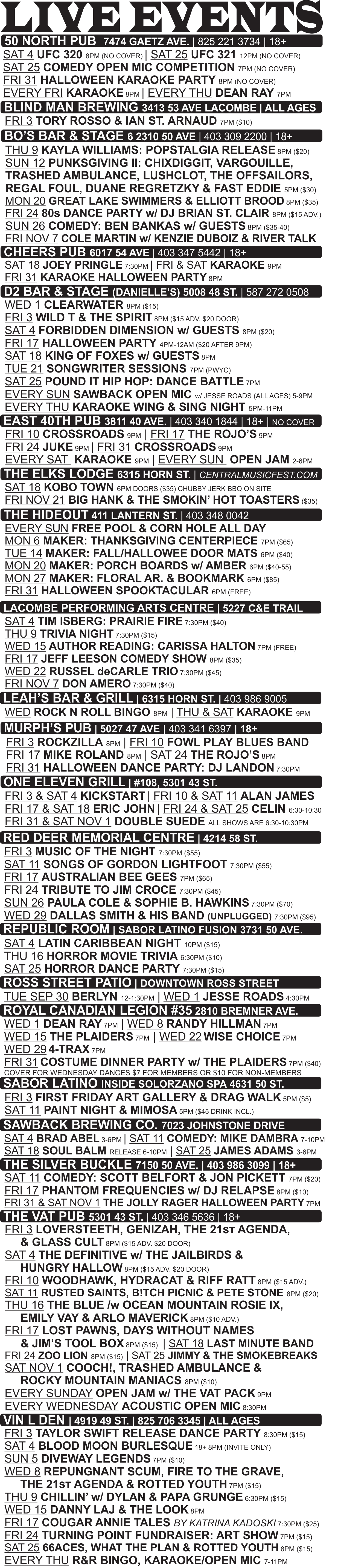Live Event Listings in Red Deer, AB Sorted alphabetically by venue name. Then, chronologically by venue. October 2025 Sorry this section was unavailable the last couple months, it’s back!