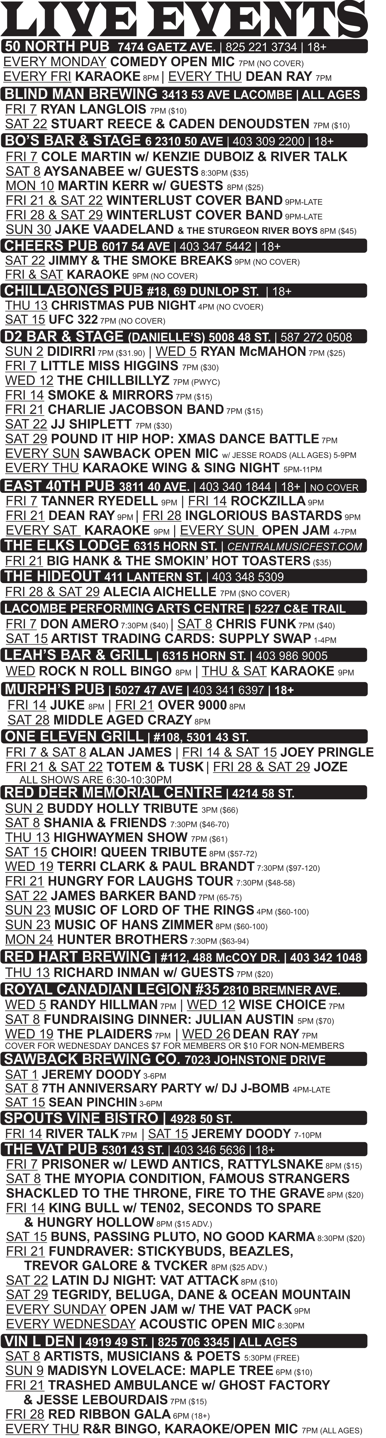 Live Event Listings in Red Deer, AB Sorted alphabetically by venue name. Then, chronologically by venue. November 2025 Sorry this section was unavailable the last couple months, it’s back!