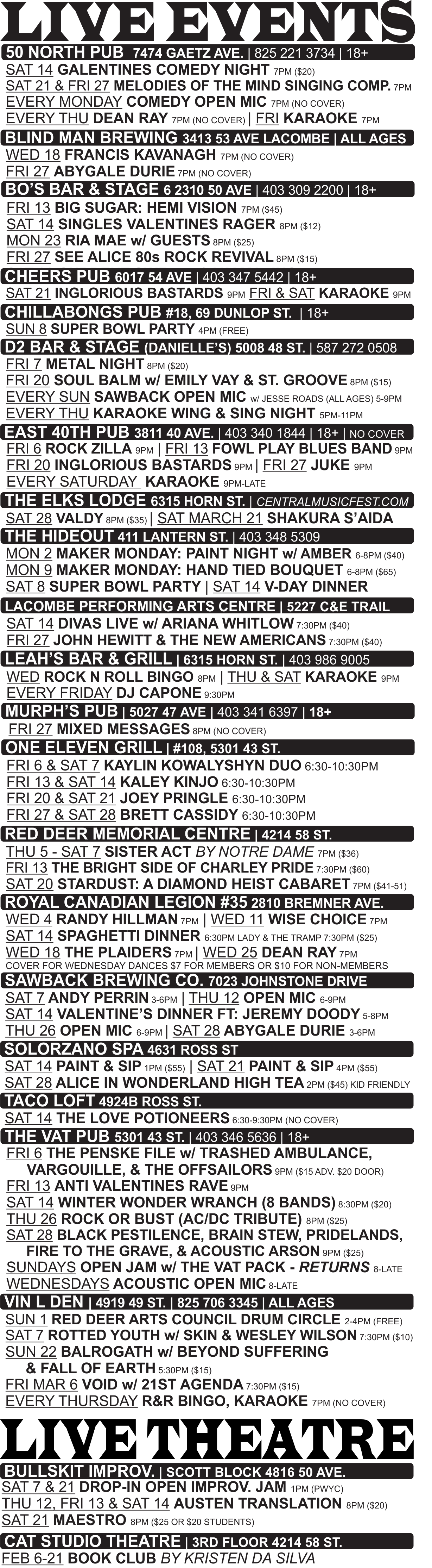 Live Event Listings in Red Deer, AB Sorted alphabetically by venue name. Then, chronologically by venue. February 2026