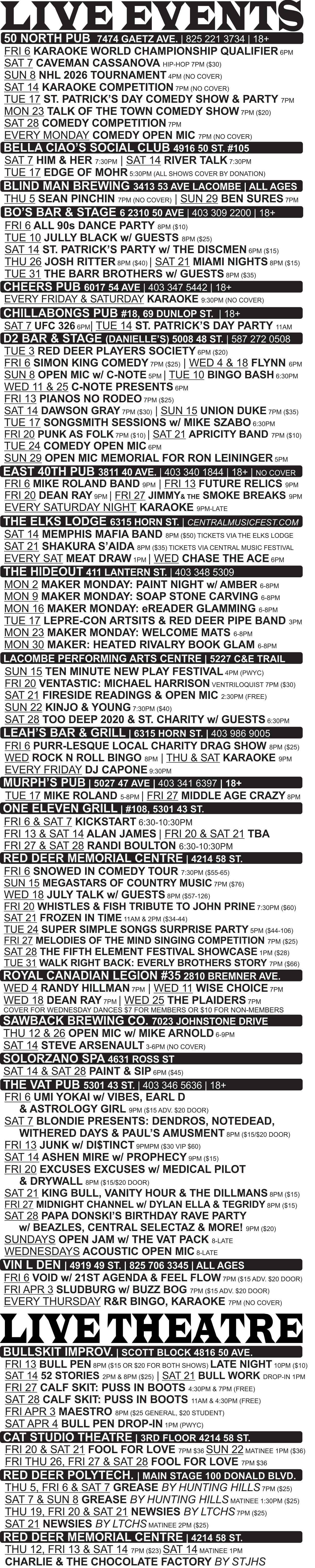 Live Event Listings in Red Deer, AB Sorted alphabetically by venue name. Then, chronologically by venue. March 2026
